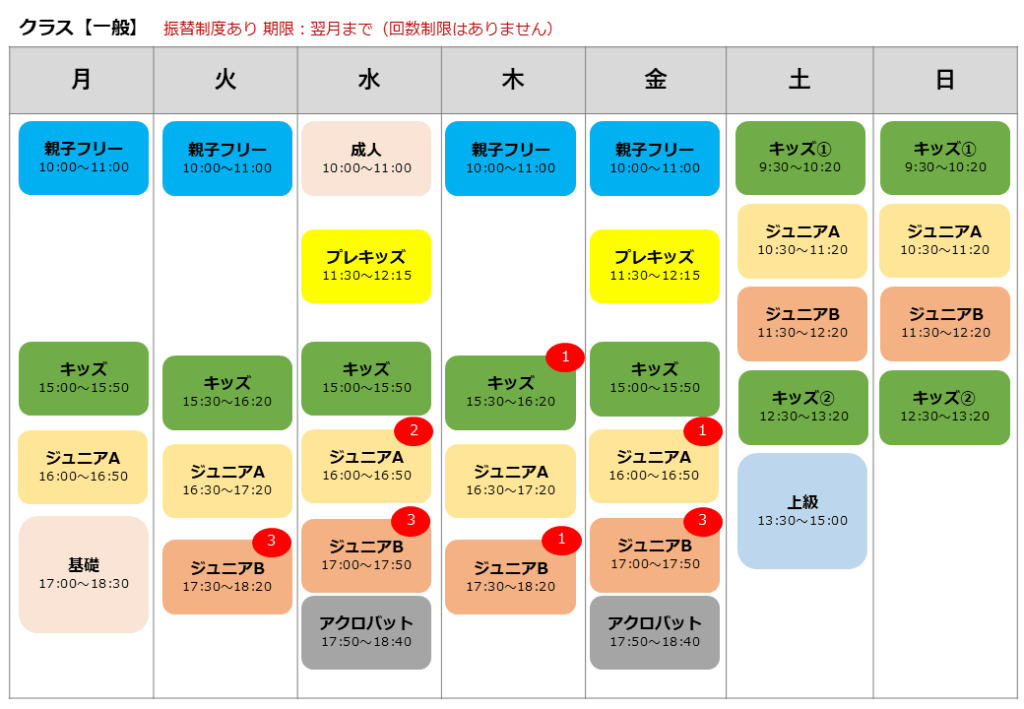 クラス曜日の空き情報