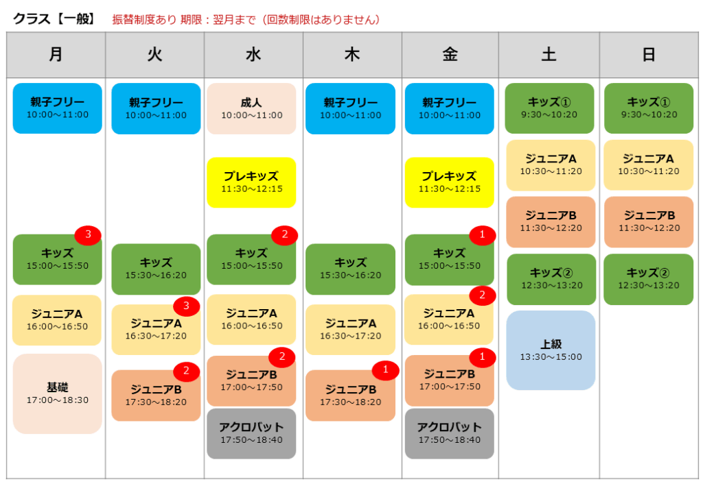 クラス曜日の空き情報